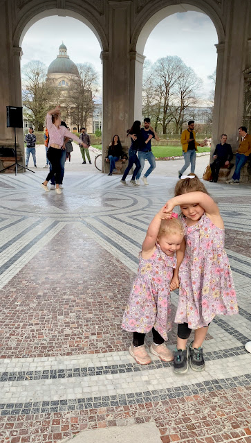 After the girls had their fill of playing, we started our walk back to our hotel. To get there, we walked back through Hofgarten and spotted a group of people dancing under the Temple of Diana. Our kids being the dancing aficionados they are, had to join in.