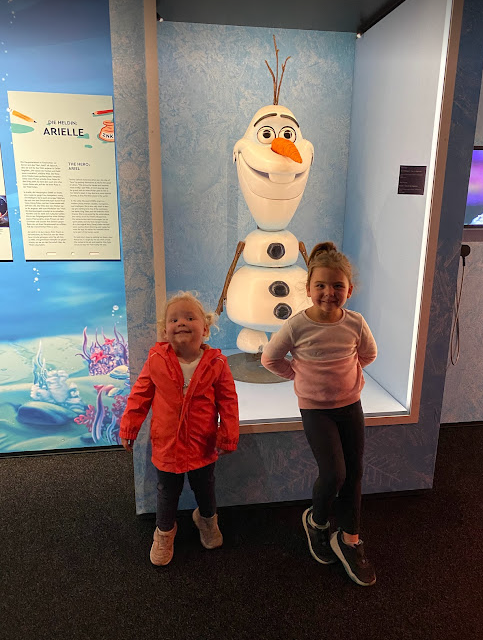 After Sea Life, we walked over to the Disney 100 exhibit. If you are going to the exhibit during your stay, be mindful of all the stairs it does take you to get down to the entrance; although, we may have missed the stroller/pram/wheelchair accessible entrance. We actually really enjoyed the exhibit. You can spend as much or as little time there as you want. There is plenty to read and see throughout the exhibit, but of course since we had little ones with us, it’s hard to stand and read for too long. The girls really did enjoy the exhibits including Frozen and Mickey. There were also headphones located throughout the exhibit where they would tell you the history or provide music for whichever cartoon you were visiting and those definitely kept the girls entertained throughout.