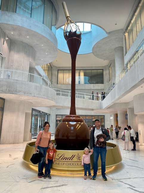 The next day, we departed early to start our journey back to Munich. Although the southern route is a few hours longer, we wanted to see Switzerland and Liechtenstein. Since we would be driving through Zurich, we booked tickets online for a tour at Lindt Chocolate Factory. At the entrance of the building, we found ourselves staring up at the massive chocolate fountain which is “over nine meters tall, with 1,500 kg of chocolate flowing through it”. Since there was some time between our arrival and the tour, we stopped at the on-site restaurant and helped ourselves to hot chocolate and sandwiches. After lunch, we went on the self-guided tour. Although extremely interesting for the parents, it was hard to keep the kids engaged until chocolate was being offered. And at the very end of the tour, they got their fair share of it!