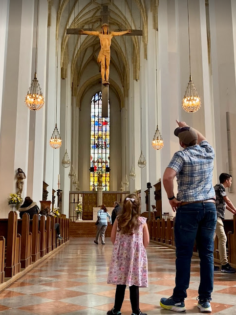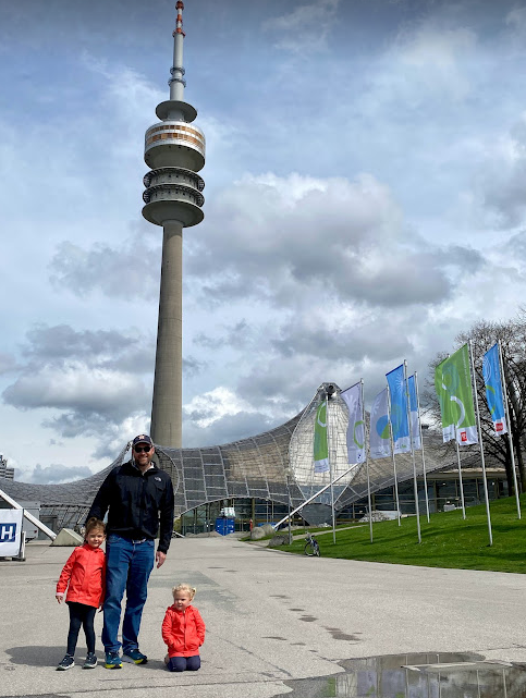 The beauty of the southern drive from the Black Forest to Munich is that you can also visit the beautiful country of Liechtenstein. While there, we stopped and took pictures of Kathedrale St. Florin. From the entrance, we could also see Vaduz Castle which is the private residence of the Prince of Liechtenstein. During our visit, the entire outside of the castle was under construction. Finally, we stopped at the Liechtenstein Center where we got our passports stamped for 3 euros each, and our oldest got to sit on a throne, wear a crown, and wave the country’s flag. Our youngest, on the other hand, slept through the visit to her 8th country.