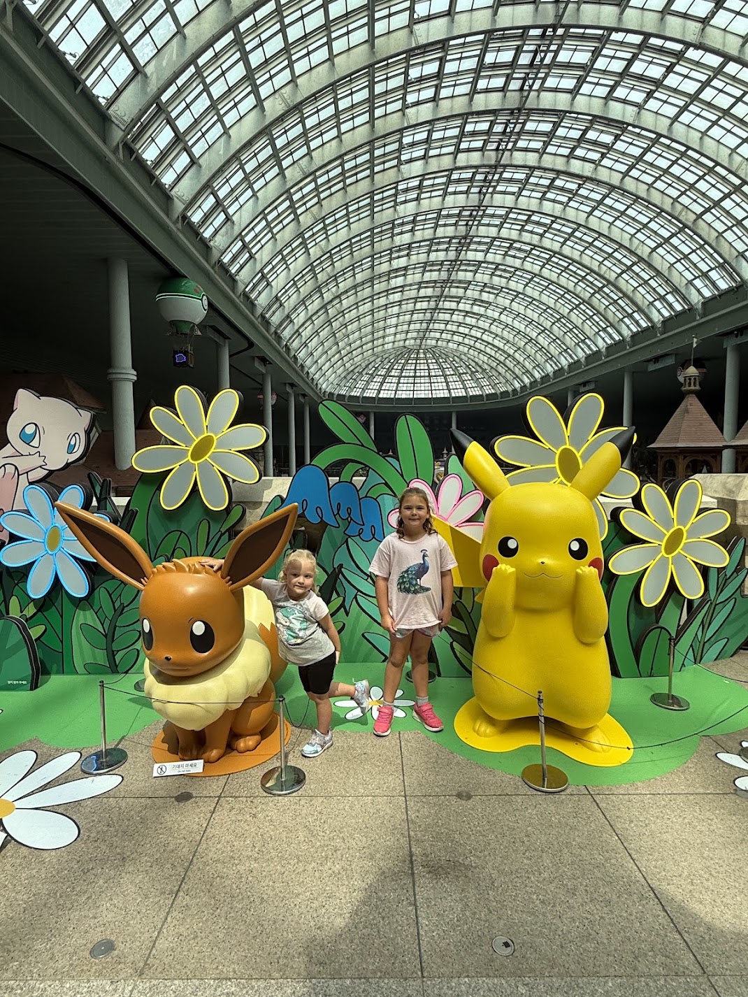 After a busy second day in Seoul, we decided “why not tack on another crazy day by going to a theme park?!” Once we woke up, we took a train over to Lotte World which is home to an indoor and outdoor theme park, as well as an ice skating rink. A huge plus is that the park had a Pokémon theme during our time there and our girls are going through a huge Pokémon phase right now.