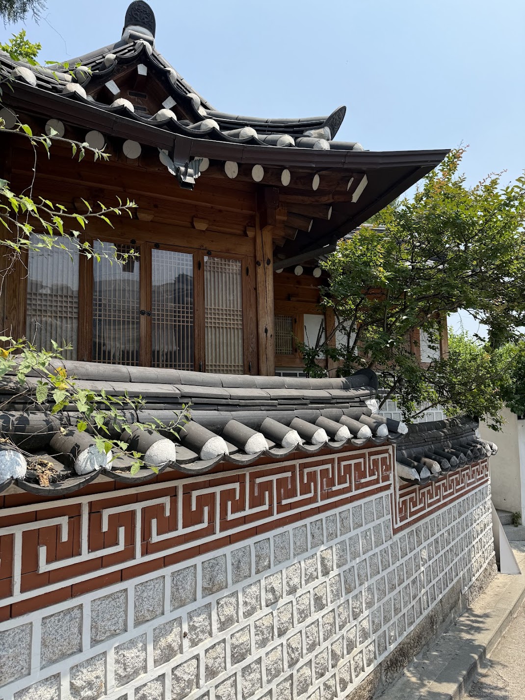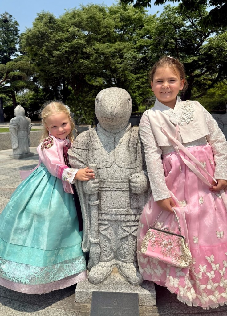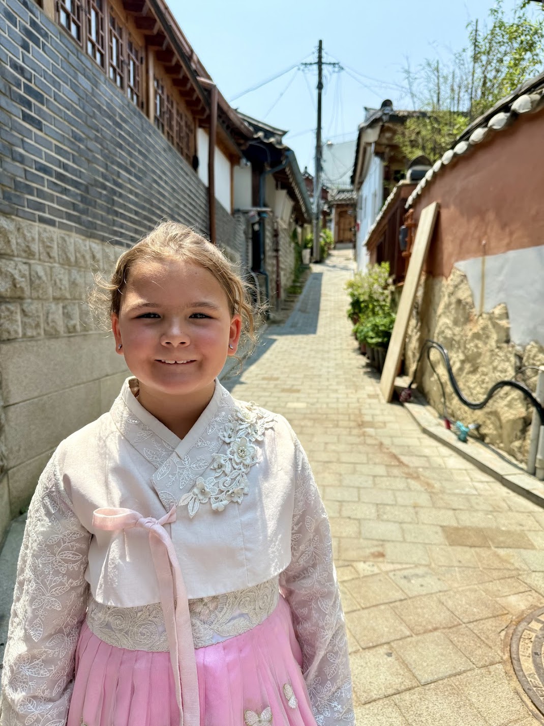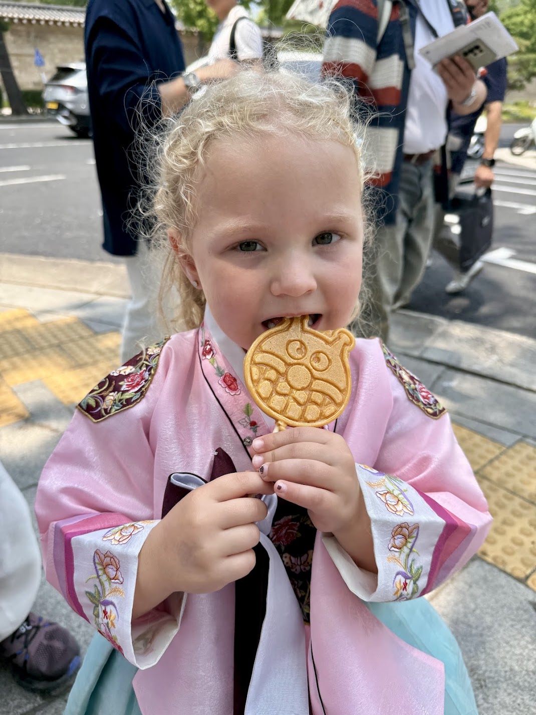 After visiting the palace grounds, we attempted a walk over to the Bukchon Hanok Village, but unfortunately, started butting into a very much needed nap time for both of our girls. Walking over in the heat with hanboks ended up turning into quite the scene. They were bribed with caramel candy, and our youngest ended up just falling asleep on her dad’s shoulders. We finally stopped at a nearby restaurant called Cafe Four M so the girls could catch a quick nap out of the heat. We did enjoy the food and drinks so recommend a stop here if in the area.