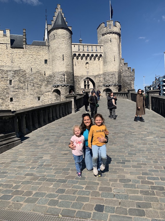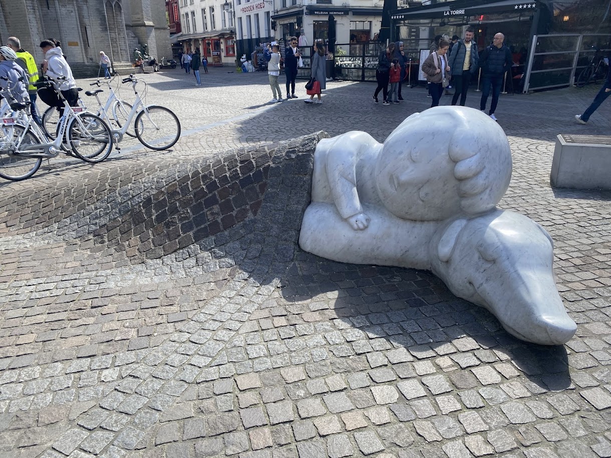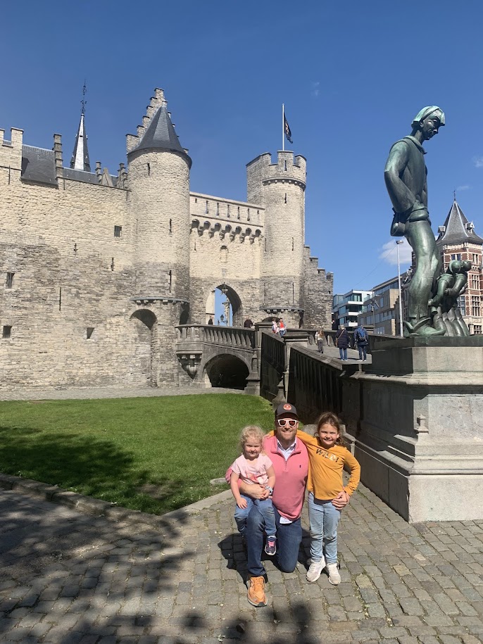 After the zoo, we started walking to Het Steen fortress. This walk gave us a great opportunity to view the city. Along the way, the girls discovered a quirky statue of a child curled up on the sidewalk as if using it as a blanket. Naturally, they climbed right on top and turned the “blanket” into their own personal slide.